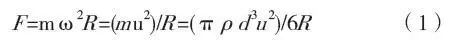 式中: F為粉塵粒子獲得的離心力,N;ω為粉塵粒子繞旋風(fēng)機(jī)軸線旋轉(zhuǎn)的角速度(即旋轉(zhuǎn)角速 度),rad/s;R為粉塵粒子與旋風(fēng)機(jī)軸線的距離(即旋轉(zhuǎn)半徑),m; m為粉塵粒子質(zhì)量,kg; d為粉塵粒子直徑,m; p為粉塵粒子真密度,kg/m3; u為粉塵粒子的切線速度,m/s。
